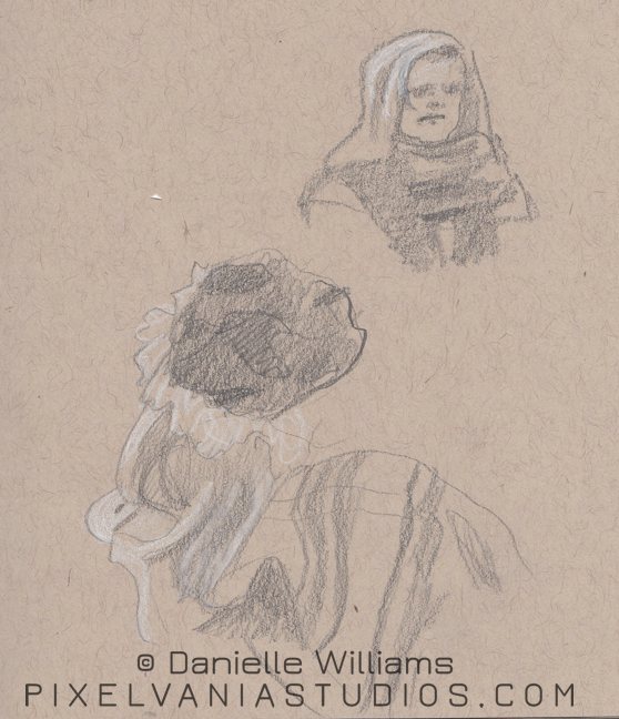 Church drawings – Boss, Mrs Claus Art My choir boss, plus studies of Mrs. Claus’ fabrics. See, this cool gal in a wheelchair dresses as Mrs. Claus every December–full on cap, white-edged fur robe, tartan blanket, the whole shebang! Related
