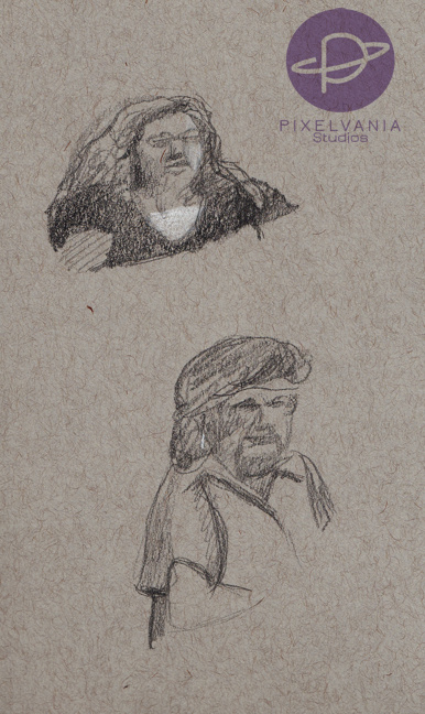 Comic artist Dirk Grundy reminded me in a recent post that caricature is an important skill, too! So instead of aiming for +++ accuracy (like the upper left image), I thought I’d try messing with proportions (like the lower left drawing!). OK, so it’s more like a “portrait charge” (French, look it up) than a hardcore caricature, but still!