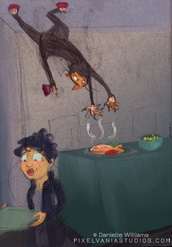 ArtOur pet cat, Pixel, dressed as a ninja…lurkin’….and smackin’ down spiders. (In reality, Pixel J. Cat prefers to dismember grasshoppers that errantly hop into our house and leave them for Mommy to discover later on.)
